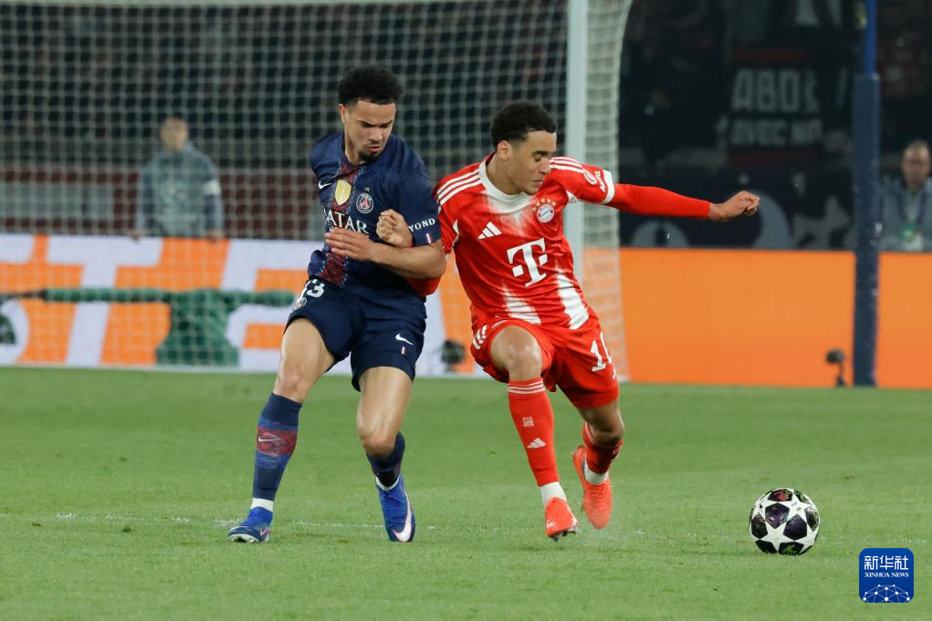 4月28日,巴黎圣日耳曼队球员扎伊尔-埃梅里(左)与拜仁慕尼黑队球员穆西亚拉在比赛中拼抢。