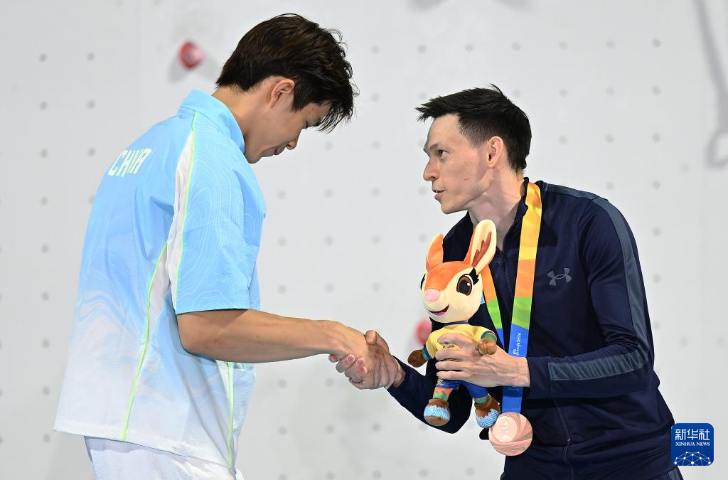 4月28日,冠军中国选手赵一程(左)与季军哈萨克斯坦选手里沙特·海布林在颁奖仪式上握手致意。