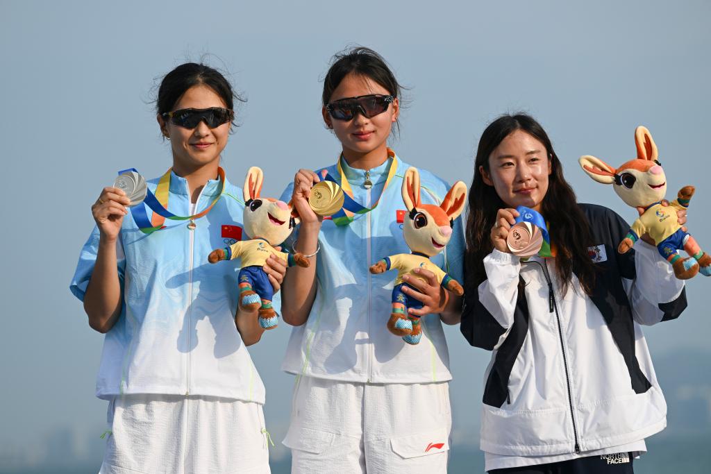 李馨璇和陈奕静在领奖台上“穿金戴银”