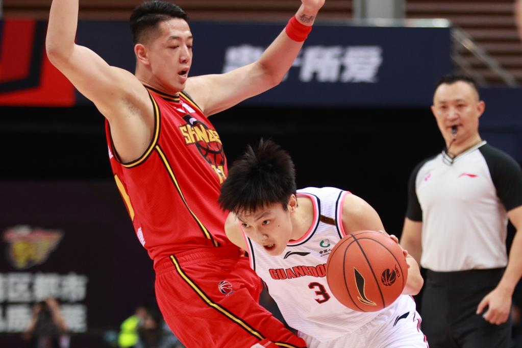 10月16日,广东东莞大益队球员胡明轩(左二)在比赛中突破深圳马可波罗队球员沈梓捷。新华社记者 刘续 摄