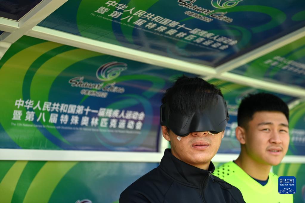 10月24日,云南队球员魏建森(左)在场边听比赛。魏建森是里约残奥会、东京残奥会中国盲人足球队队员。