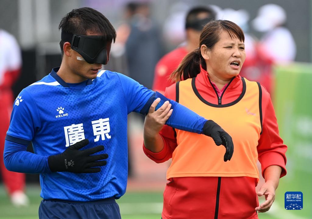 10月23日,广东队球员张家彬(左)在引导员林月红的协助下离场。张家彬是东京残奥会中国盲人足球队队长。