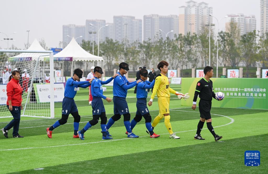 10月23日,广东队在比赛前入场。守门员王圳(右二)和队长张家彬(右三)是东京残奥会中国盲人足球队队员。
