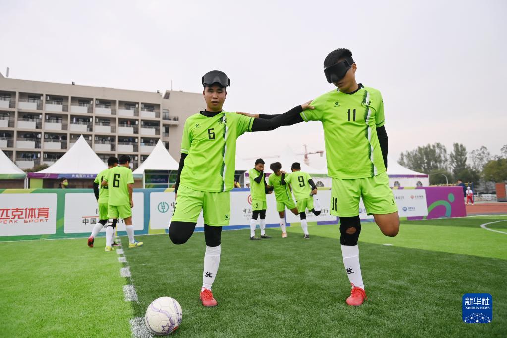 10月23日,辽宁队球员朱瑞铭(前右)和唐治华在比赛前热身。朱瑞铭和唐治华是东京残奥会中国盲人足球队队员。