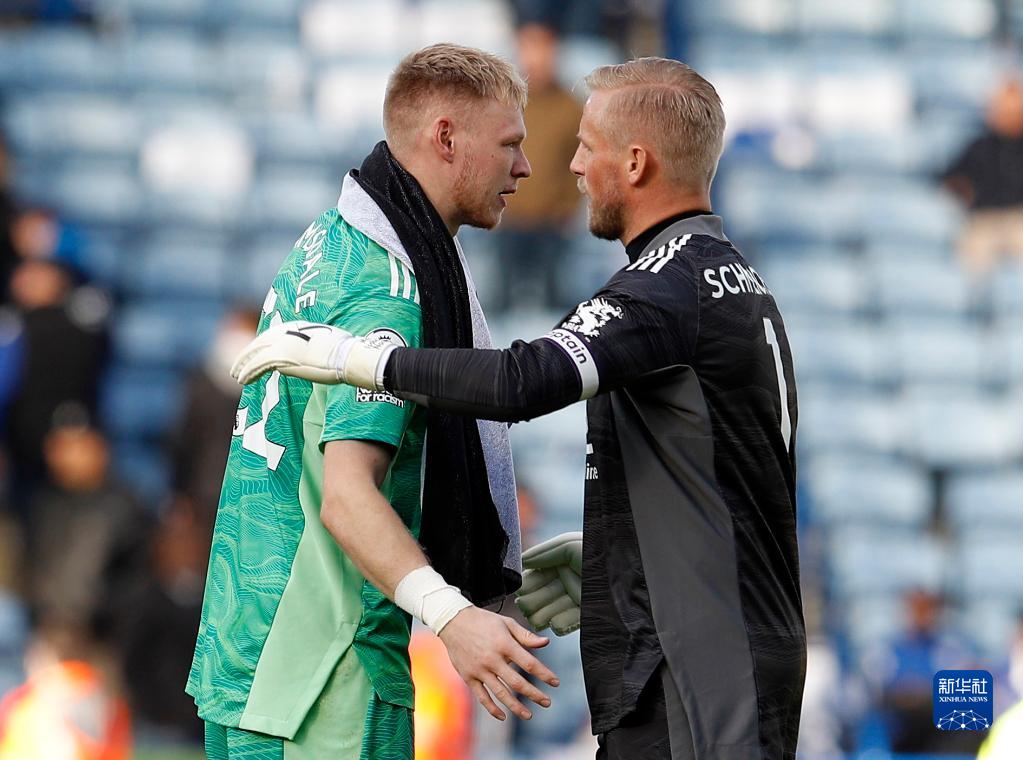 10月30日,阿森纳队守门员拉姆斯代尔(左)赛后和莱斯特城队守门员卡斯帕·舒梅切尔致意。