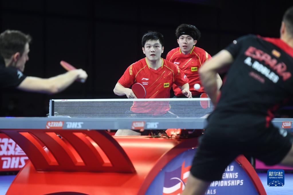 当日,在美国休斯敦进行的2021世界乒乓球锦标赛男双第三轮比赛中,中国组合樊振东/王楚钦以3比1战胜跨国组合罗夫莱斯(西班牙)/约内斯库(罗马尼亚)。
