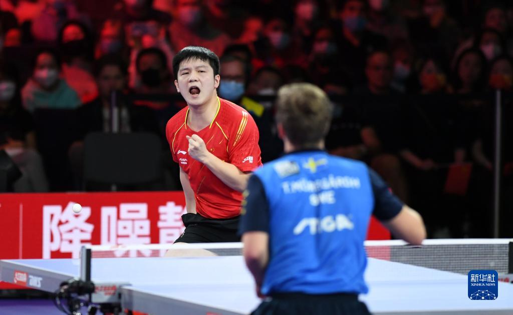 11月29日,樊振东(左)在比赛中庆祝得分。