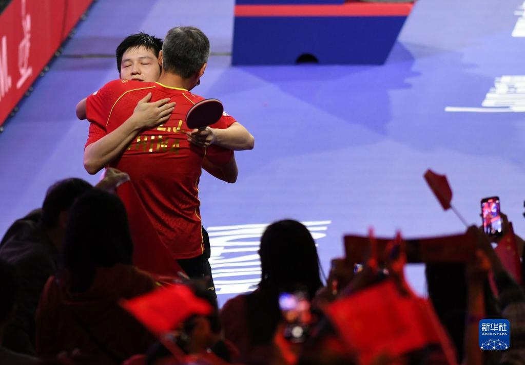 11月29日,樊振东(左)夺冠后与教练秦志戬拥抱庆祝。