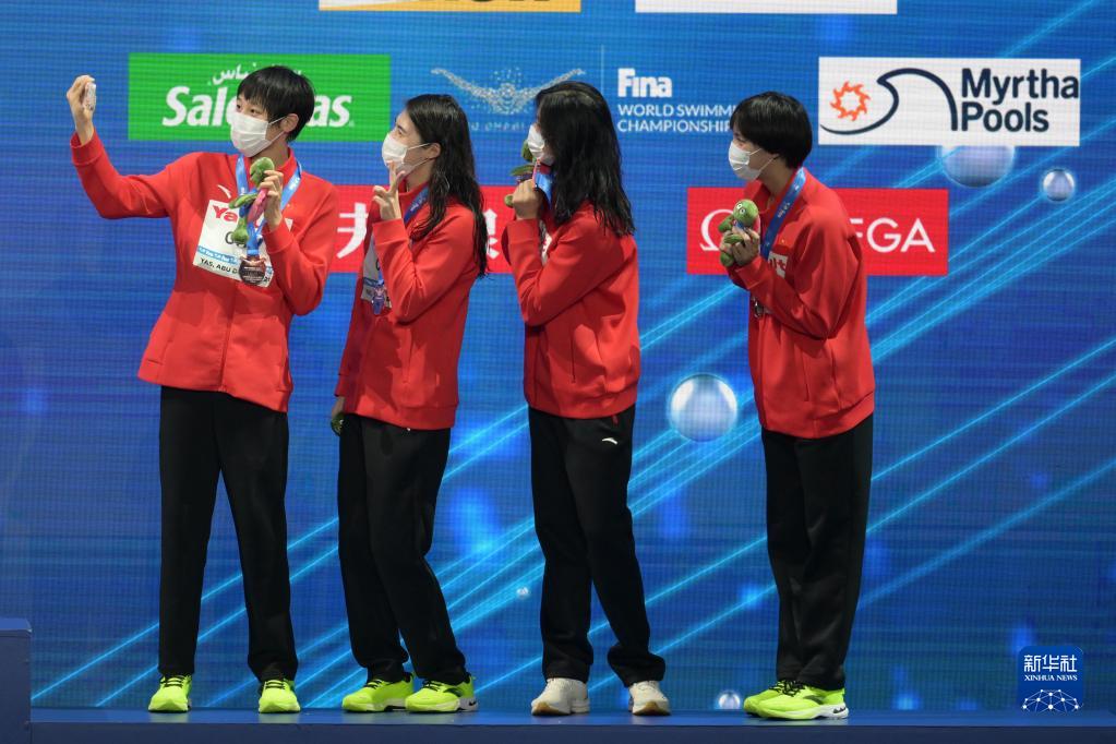 12月20日,中国队选手彭旭玮(右一)、唐钱婷(右二)、张雨霏(右三)和程玉洁(右四)在领奖台上合影。