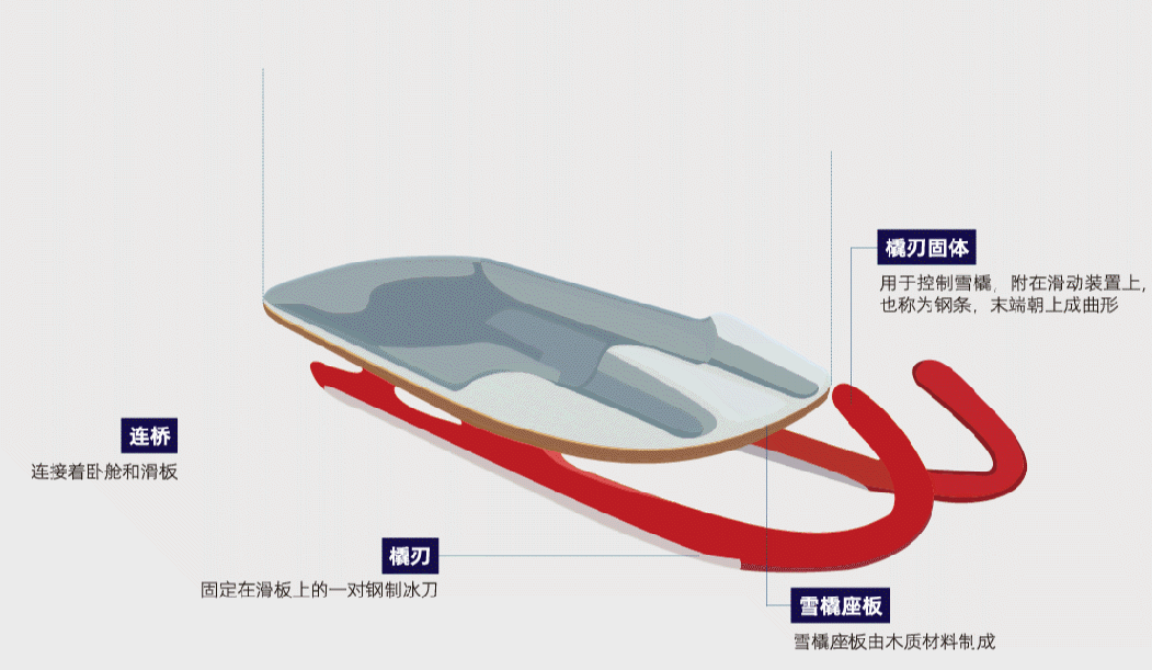 雪橇也被称为平底雪橇、短雪橇,有单座和双座两种规格。相对于雪车而言,雪橇没有操纵滑板的舵和制动器。