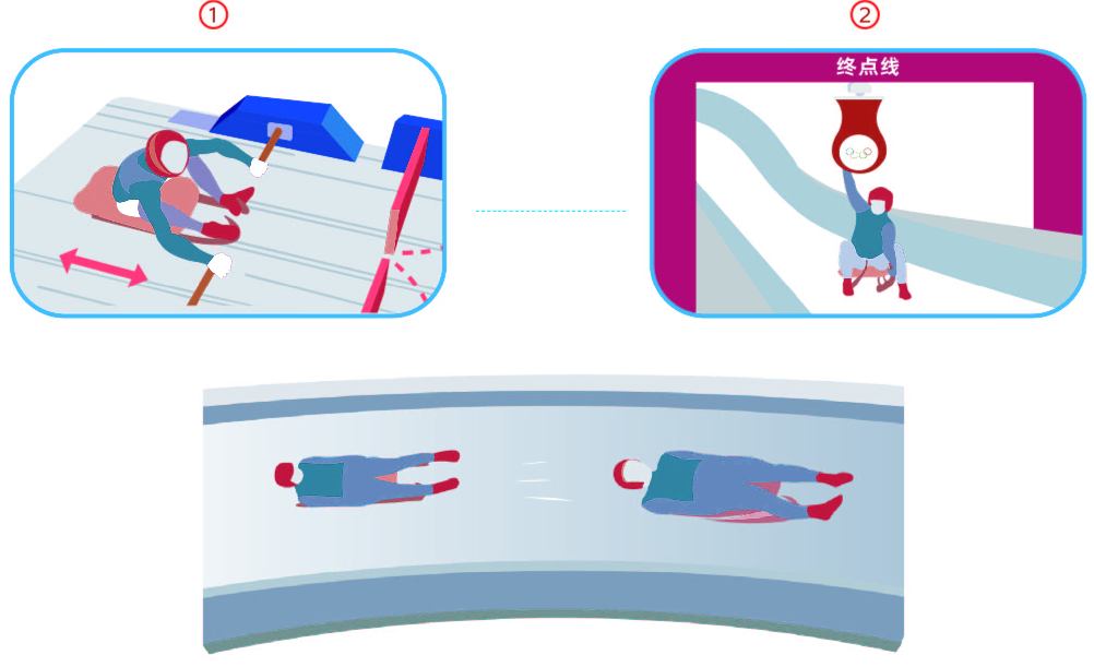 雪橇禁止安装操控方向的舵和制动装置,仅限通过运动员的脚或身体的左右轻微摆动来操纵。