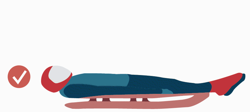 参赛运动员仰面背躺,双脚在前,头部微微抬起。比赛开始时,运动员有30~45秒的准备时间,通过调整体位寻找最佳启动速度。出发时,选手用手在冰面上向后滑,获得助推力,提升速度。在加速阶段,头部微抬获知方向,通过双脚或身体左右微摆,调整滑行路线。制动时,选手手握滑板产生向后压力,同时将脚放在冰面上,进行减速。