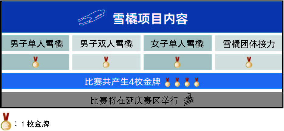 北京2022年冬奥会雪车比赛将一共产生4枚金牌。竞赛项目包括男子单人雪橇、男子双人雪橇、女子单人雪橇和雪橇团体接力。比赛将在延庆赛区进行。