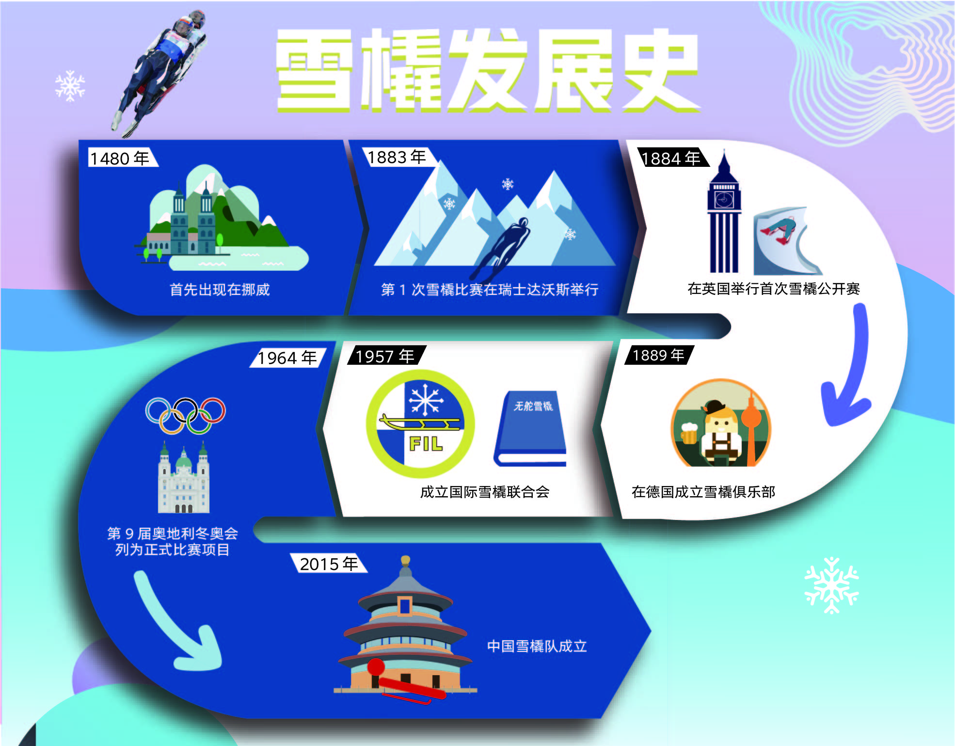 早在1480年,雪橇已在挪威出现。由于雪橇集挑战性、刺激性于一体,很快就在欧洲和北美国家流行起来。1883年,第1次雪橇比赛在瑞士达沃斯举行,1年之后,英国举行了首次雪橇公开赛。1889年,在德国成立雪橇俱乐部。尽管雪橇起源早、发展快,但是被列入冬奥会比赛项目却相对较晚。1957年,国际雪橇联合会成立后,才将该项目正式列入第9届奥地利因斯布鲁克冬奥会比赛项目。与欧美国家相比,我国雪橇项目起步较晚,2015年组建了首支雪橇国家队,填补了该项目在我国的空白。