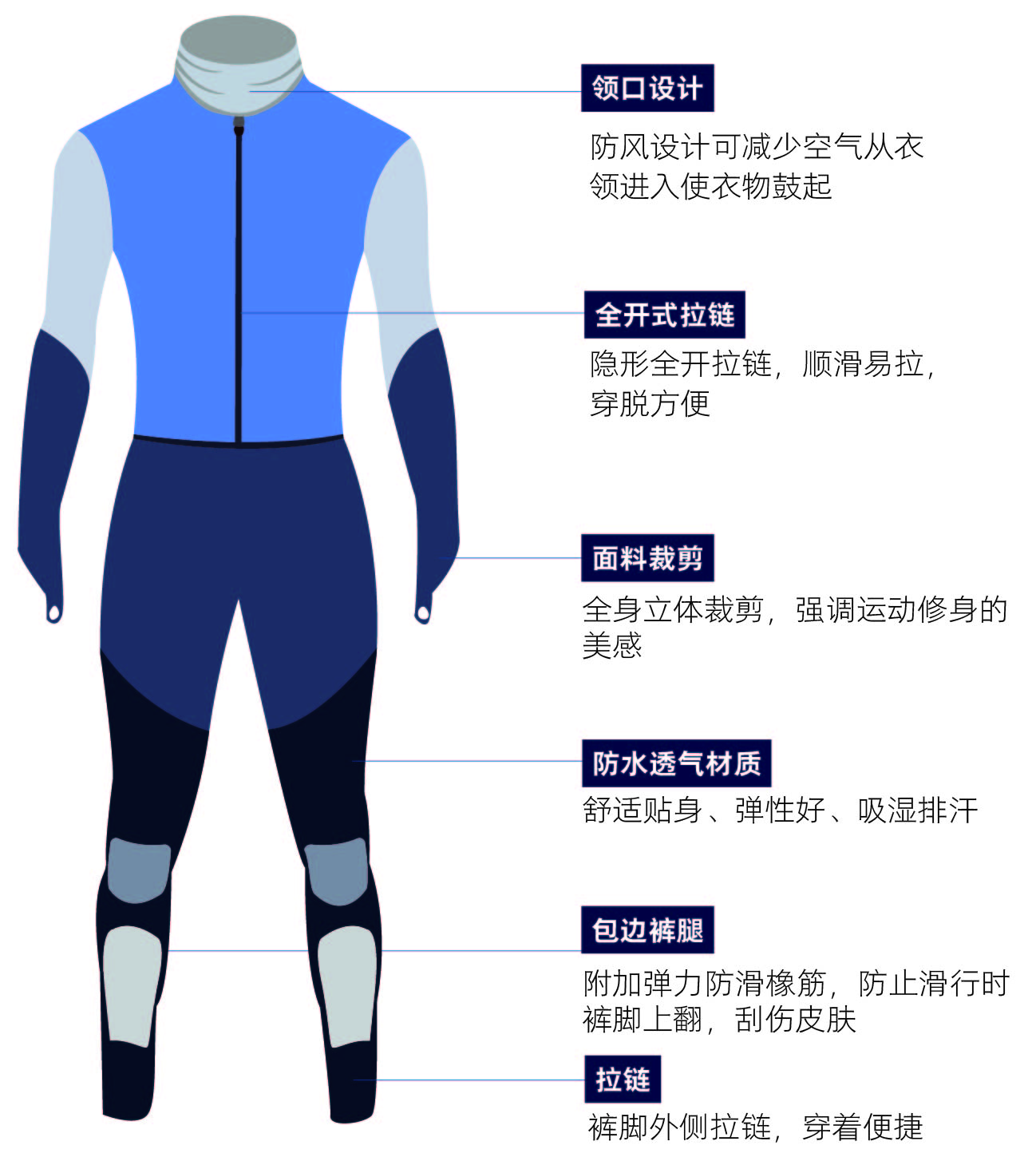 滑雪服由合成材料制作而成,衣裤连体,不仅光滑贴身、富有弹性,还可以将滑行时的空气阻力降到最低。