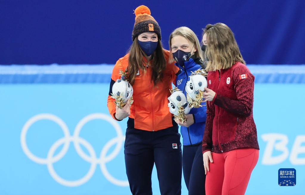 2月7日,冠军意大利选手阿里安娜·方塔纳(中)与亚军荷兰选手苏珊娜·舒尔廷(左)、季军加拿大选手金·布廷在领奖台上庆祝。