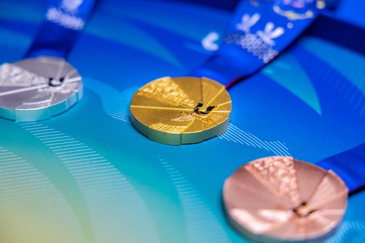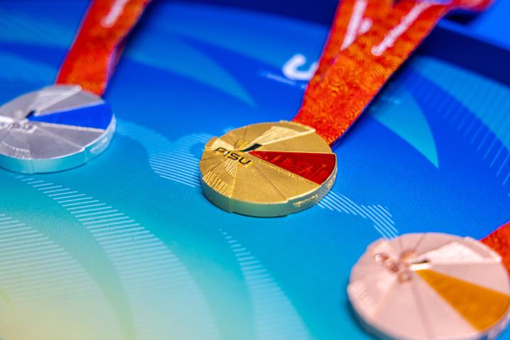 设计师黄乔逸介绍,奖牌正面设计赋予“太阳神鸟”羽翼几何感,与赛会会徽“U”呼应,犹如神鸟,振翅欲飞,寓意守护梦想,自信昂扬飞往多彩未来,契合成都大运会口号“在成都,成就每一个梦想”。