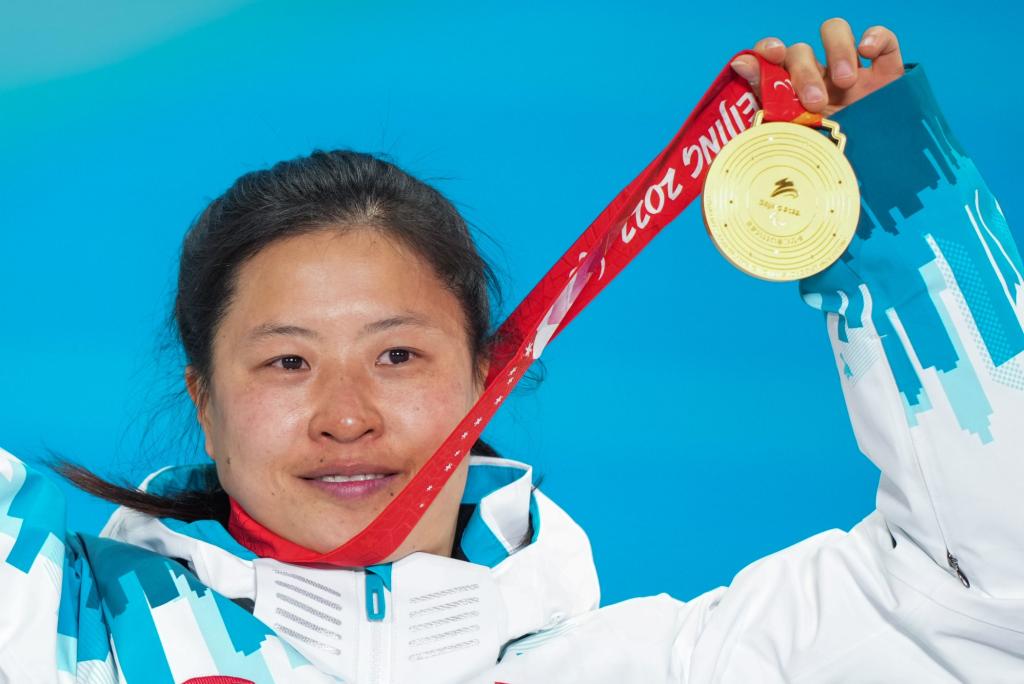 3月6日,北京冬残奥会残奥越野滑雪女子长距离(坐姿)奖牌颁发仪式在张家口赛区颁奖广场举行,图为获得冠军的中国选手杨洪琼展示金牌。新华社记者彭子洋摄