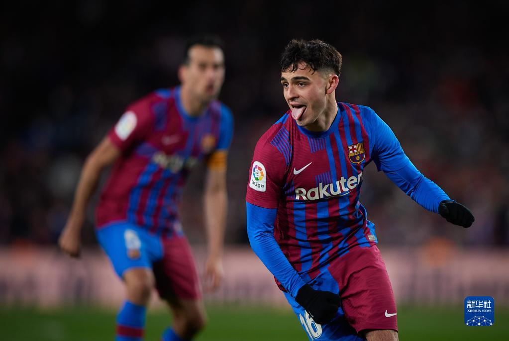 4月3日,巴塞罗那队球员佩德里在比赛中庆祝进球。