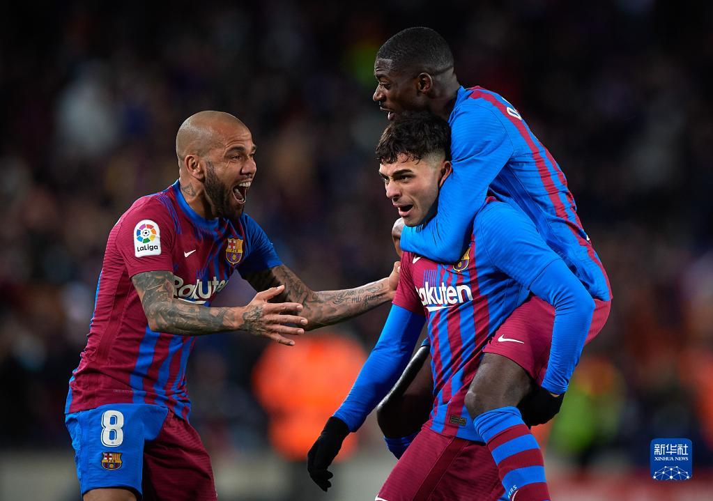 4月3日,巴塞罗那队球员佩德里(左二)在比赛中与队友庆祝进球。