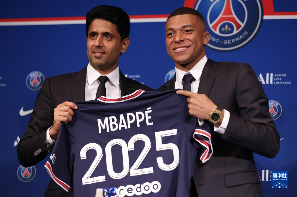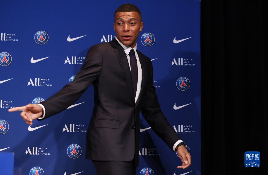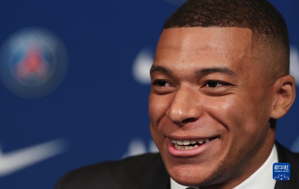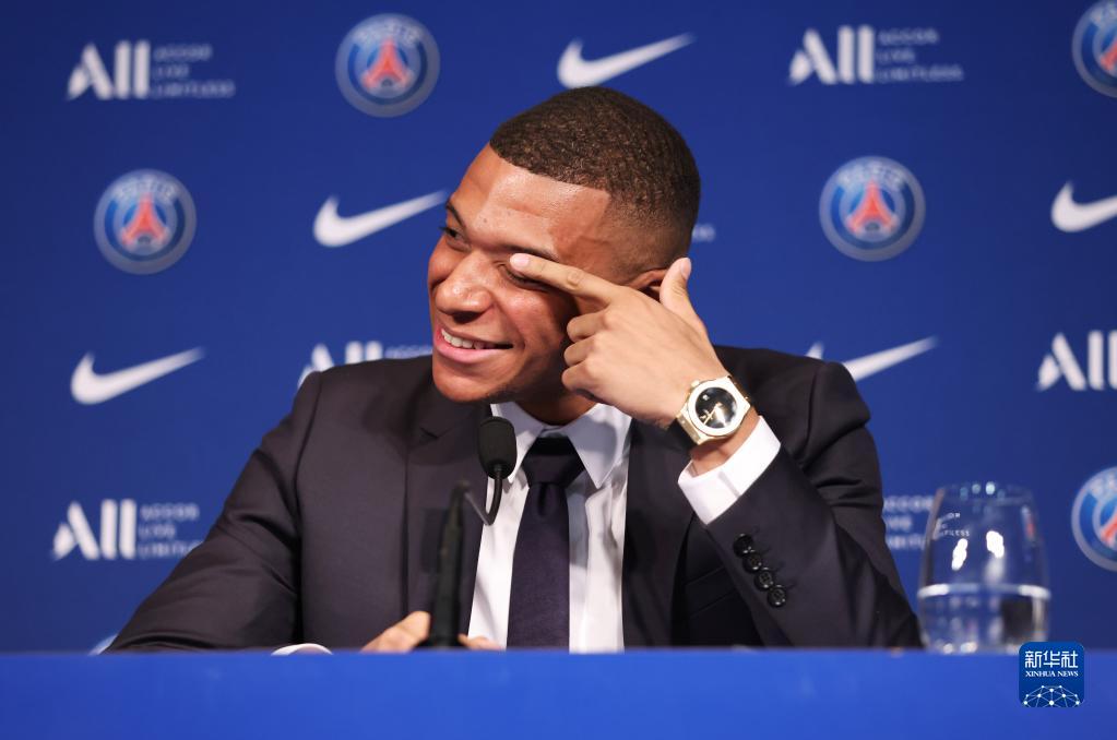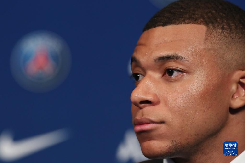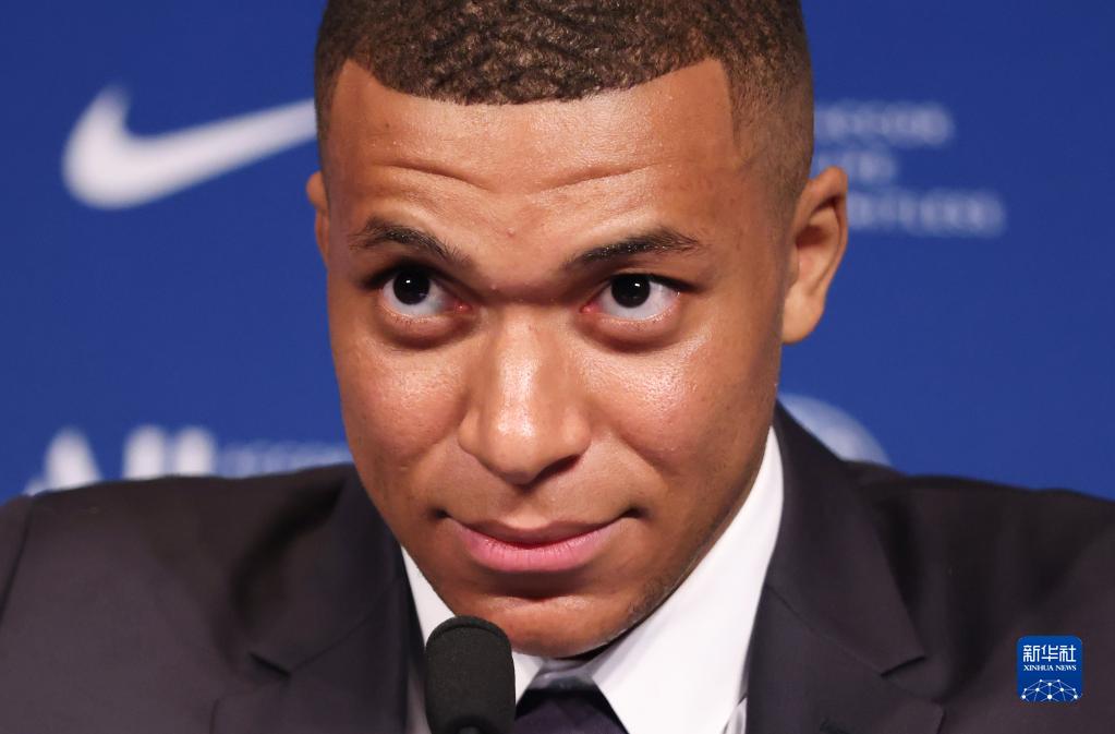 5月23日,在法国巴黎王子公园球场,姆巴佩出席与巴黎圣日耳曼俱乐部续约的新闻发布会。新华社记者 高静 摄