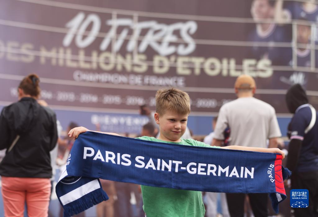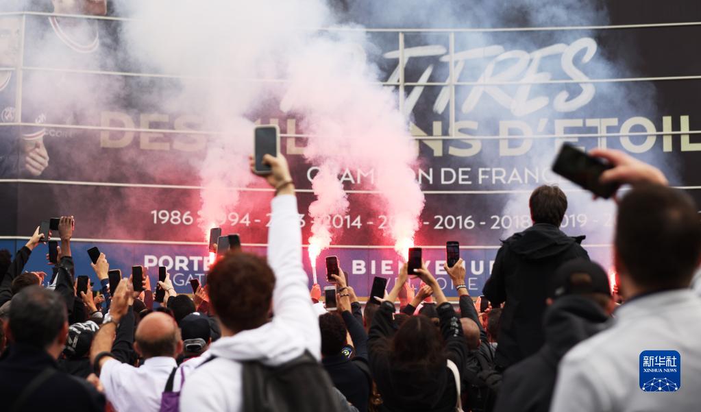 5月23日,在法国巴黎王子公园球场外,球迷庆祝姆巴佩与巴黎圣日耳曼俱乐部续约。新华社记者 高静 摄