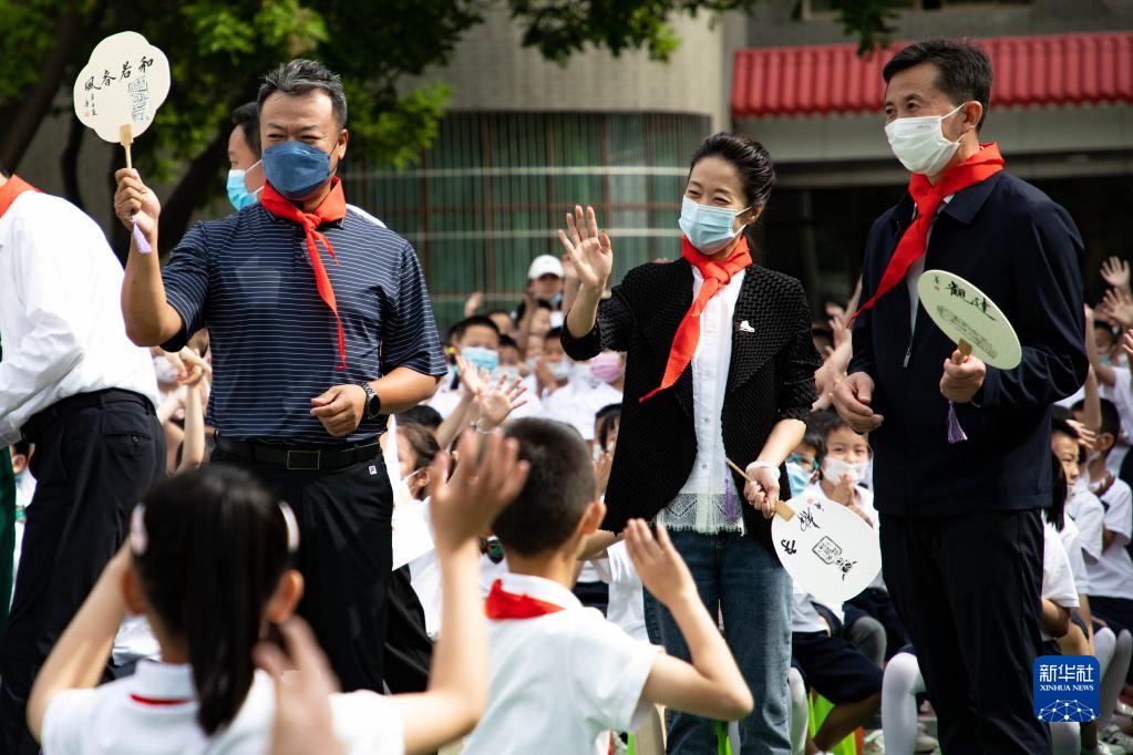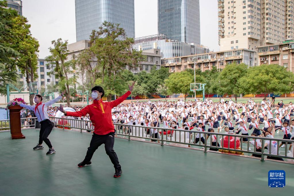 5月27日,花样滑冰广播操示范员彭程(左一)、沈鸿飞(左二)带领东郊学校学生做操。