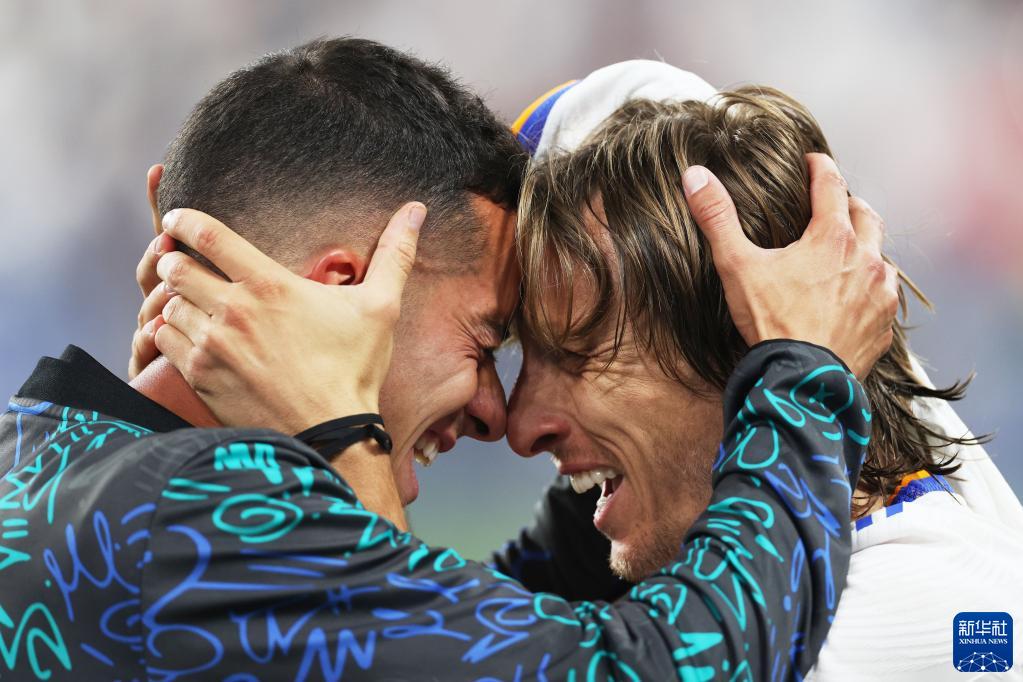 5月28日,皇家马德里队球员莫德里奇(右)与巴斯克斯在比赛后庆祝球队夺冠。