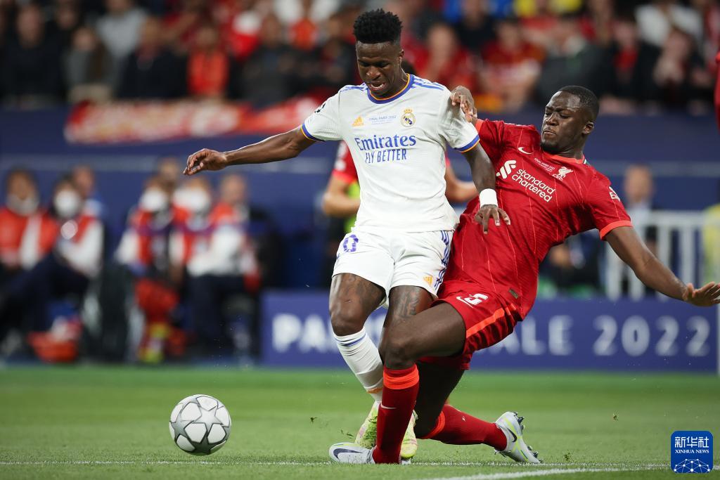 5月28日,皇家马德里队球员维尼修斯(左)与利物浦队球员科纳特在比赛中拼抢。