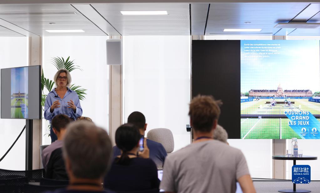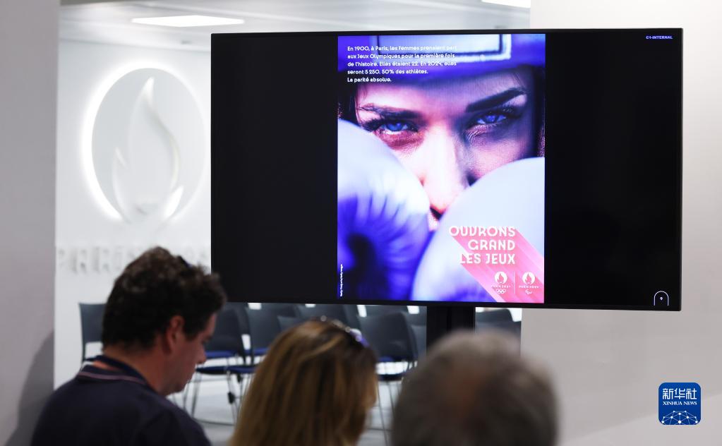 7月25日,带有2024年巴黎奥运会和残奥会口号的海报在发布会现场屏幕上展示。新华社记者 高静 摄