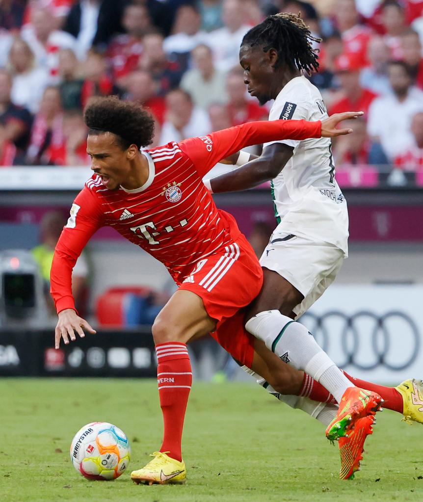 拜仁慕尼黑队球员萨内(左)在比赛中与门兴格拉德巴赫队球员科内拼抢。新华社发(菲利普·鲁伊兹摄)