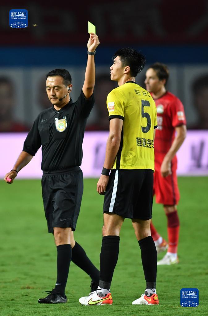 8月28日,主裁判刘威(左)在比赛中向广州队球员吴少聪出示黄牌。新华社记者 李嘉南 摄