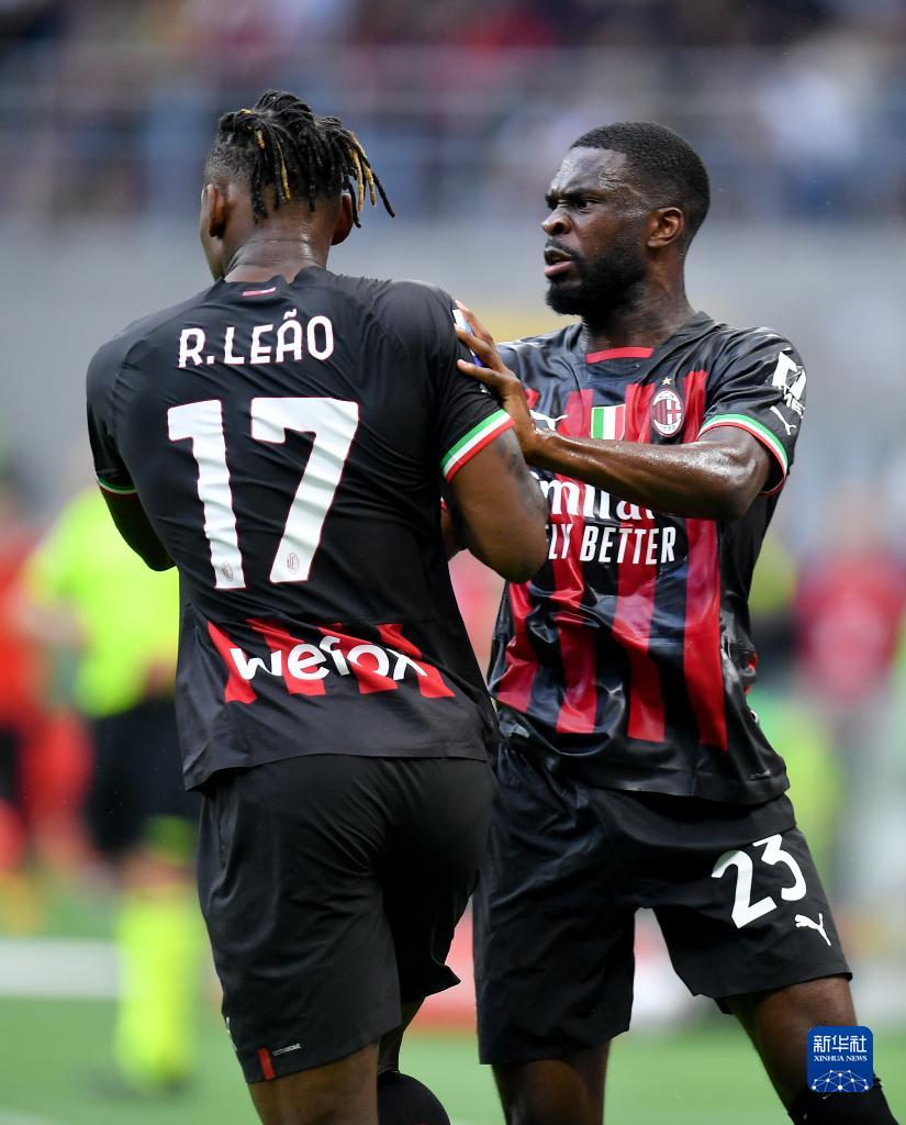 9月3日,AC米兰队球员莱奥(左)在比赛中进球后与队友托莫里庆祝。