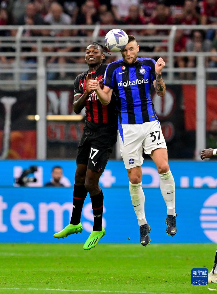 9月3日,AC米兰队球员莱奥(左)与国际米兰队球员什克里尼亚尔在比赛中争顶。