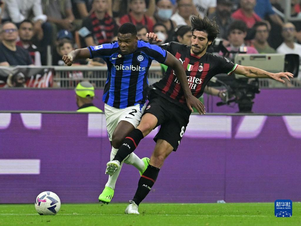 9月3日,AC米兰队球员托纳利(右)与国际米兰队球员邓弗里斯在比赛中拼抢。