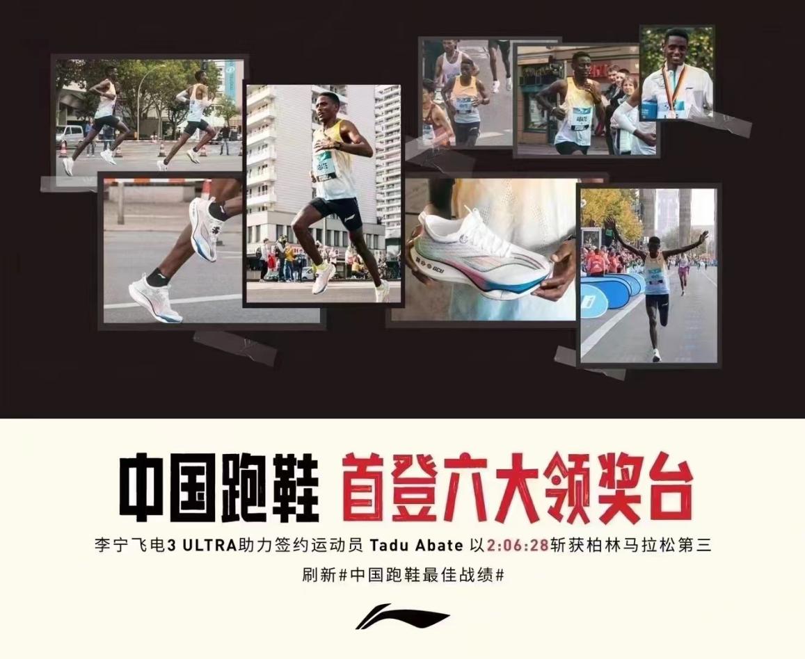 当柏林马拉松季军阿巴特和冠军基普乔格、亚军科里尔携手一同站上领奖台,展示人类运动史上伟大一刻的时候,阿巴特足下的李宁飞电3Ultra跑鞋不仅仅见证了历史,也开创了一个全新的历史:中国运动品牌打破国际巨头对大满贯赛事领奖台的垄断,首次跻身世界巅峰,同时也创造了中国跑鞋的最快纪录。