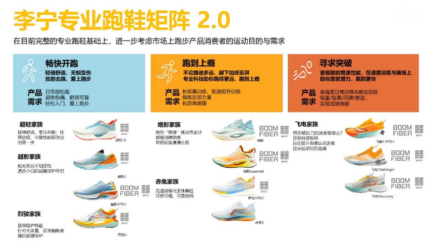 作为率先搭建起完整跑鞋矩阵的国内运动品牌,李宁针对各阶段跑者的不同需求,将从专业竞速到触及入门的跑者分为寻求突破、跑道上瘾、畅快开跑三个阶段,提供专属解决方案,打造适用于高强度跑步训练&比赛的飞电家族,适用于进阶提升跑步训练&比赛的绝影家族、赤兔家族,适用于日常慢跑&中低强度跑的烈骏家族、越影家族、超轻家族。