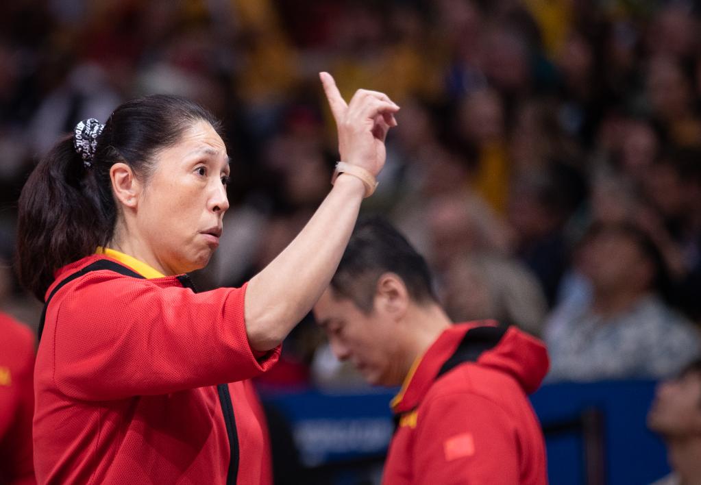 10月1日,中国队主教练郑薇(前)在比赛中指挥。新华社发(胡泾辰摄)