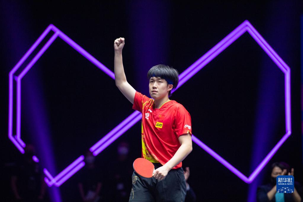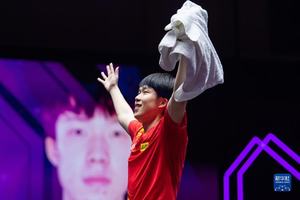 10月23日,王楚钦在比赛后庆祝胜利。新华社记者 张金加 摄