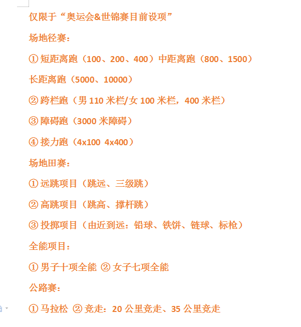 田径运动包括跑、跳、投、竞走以及由上述部分项目组合而成的全能项目。比赛一般将田径赛事分为场地赛与公路赛,场地赛包含田赛项目(以跳与投为主),径赛项目(以跑为主),以及全能项目(男子十项、女子七项)。公路赛则由路跑项目(以马拉松为代表)和竞走项目组成。以巴黎奥运会为例,田径比赛就有40多项呢!如图: