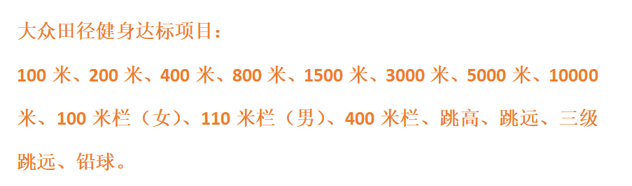 作为运动之母,田径就在我们身边。如今,为了方便大家检测自身水平,中国田协在社区、学校等地开展了一系列大众田径健身赛事及活动,这一季让我们来一一熟悉这些项目吧!如图: