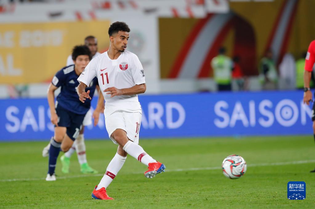 2019年2月1日,卡塔尔队球员阿菲夫(前)在对阵日本队的亚洲杯决赛中主罚点球得分。新华社记者丁旭摄