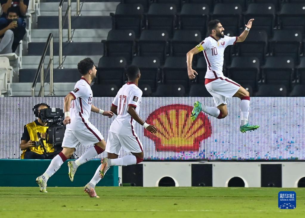 2021年6月7日,卡塔尔队球员海多斯(右)在世预赛中打入点球后庆祝。新华社发(尼库 摄)