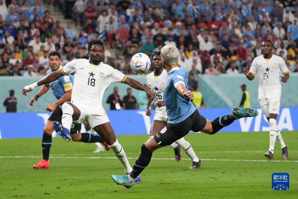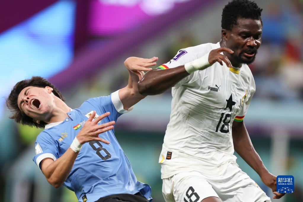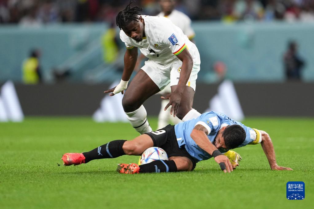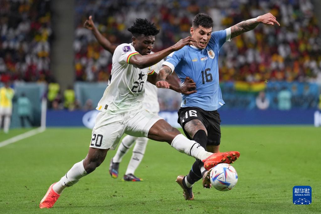 12月2日,乌拉圭队球员法昆多·佩利斯特里(左)与加纳队球员阿马泰在比赛中拼抢。新华社记者 潘昱龙 摄