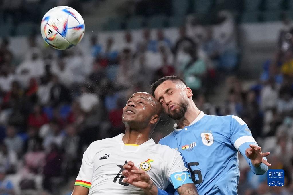 12月2日,乌拉圭队球员罗德里戈·本坦库尔(右)与加纳队球员安德烈·阿尤在比赛中争顶。新华社记者 郑焕松 摄