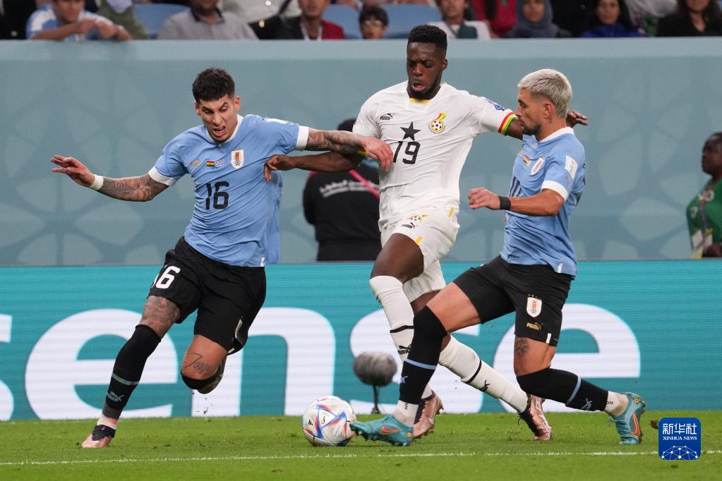 12月2日,加纳队球员伊纳基·威廉姆斯(中)与乌拉圭队球员马蒂亚斯·奥利韦拉(左)在比赛中拼抢。新华社记者 李钢 摄