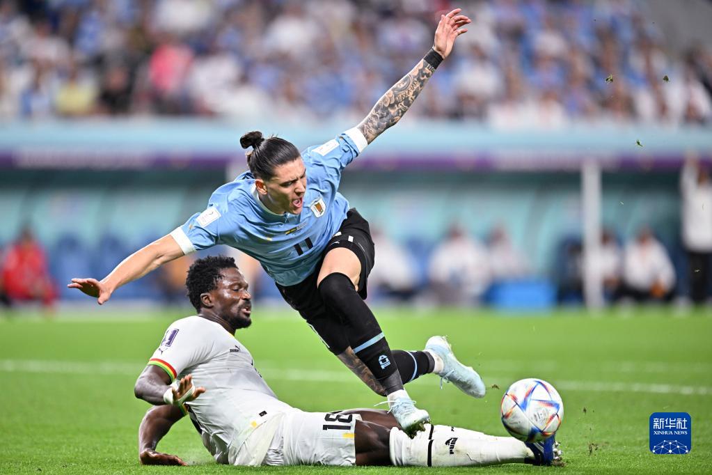 12月2日,乌拉圭队球员达尔温·努涅斯(上)与加纳队球员阿马泰在比赛中拼抢。新华社记者 辛悦卫 摄