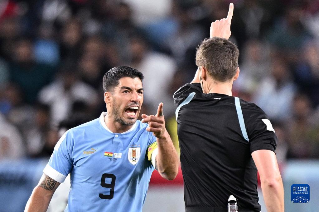 12月2日,乌拉圭队球员路易斯·苏亚雷斯(左)在比赛中与主裁判交流。新华社记者 辛悦卫 摄