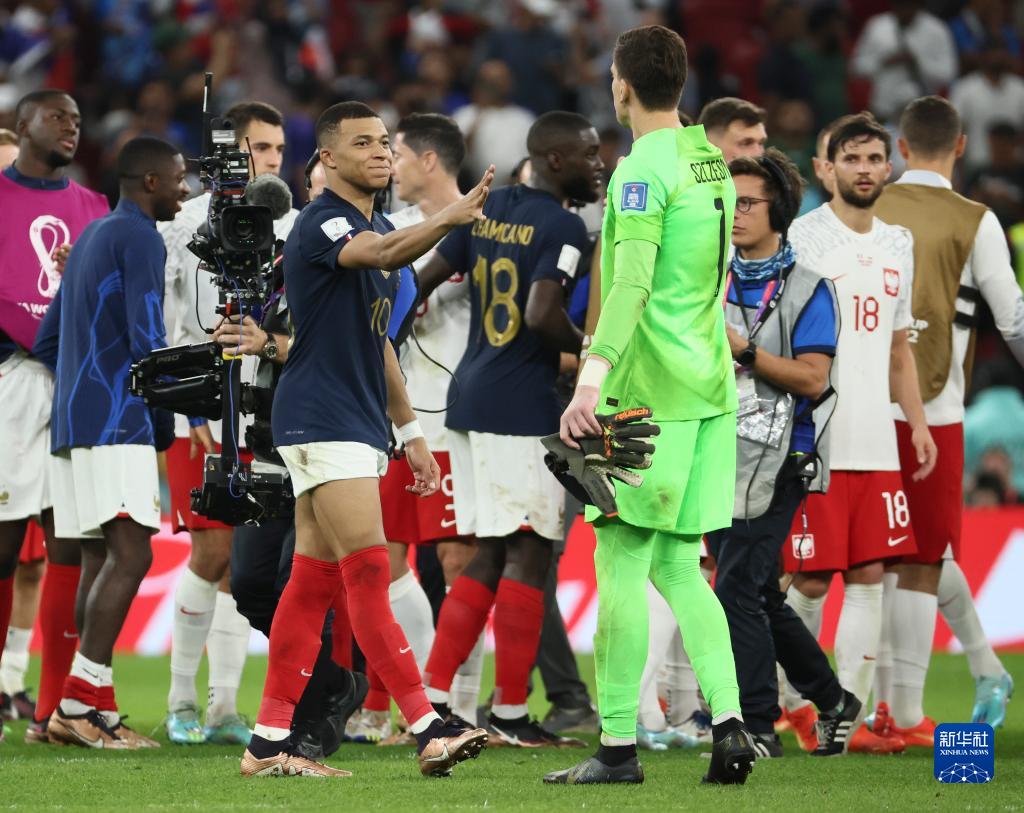 12月4日,姆巴佩(左前)在比赛后与波兰队守门员什琴斯尼(右前)互相致意。新华社记者 兰红光 摄