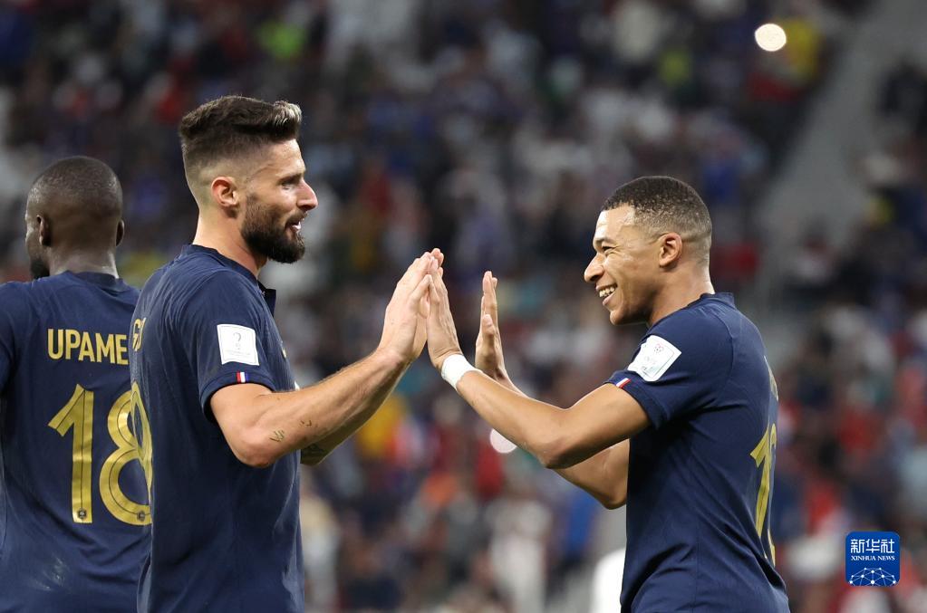 12月4日,姆巴佩(右)进球后与队友吉鲁庆祝。新华社记者 曹灿 摄